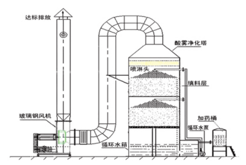 通風中需處理的廢氣,由玻璃鋼離心風機壓入噴淋塔之進氣短后,垂直向上與噴淋段自上而下的吸收液起中和反應,使廢氣濃度降低,然后繼續(xù)向上進入填料段,廢氣在塑料球打滾再與吸收液起中和反應,使廢氣濃度進一步降低后進入脫水器段,脫水液滴,凈化后達到排放標準。